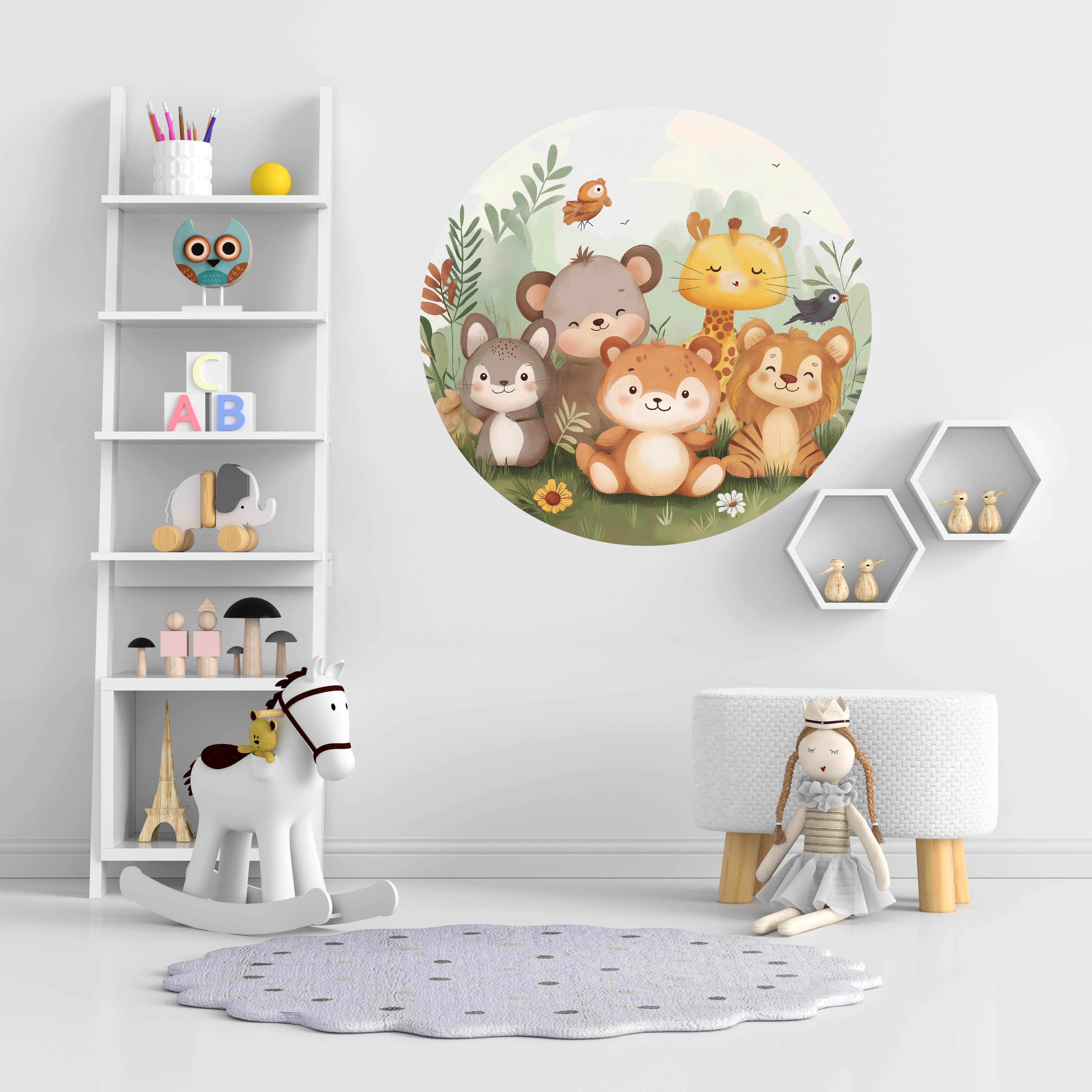 Çizgi Efektli Sevimli Hayvanlar Yuvarlak Sticker, Yuvarlak Şekilli Sticker, Çocuk Bebek Odası Duvar Dekoru
