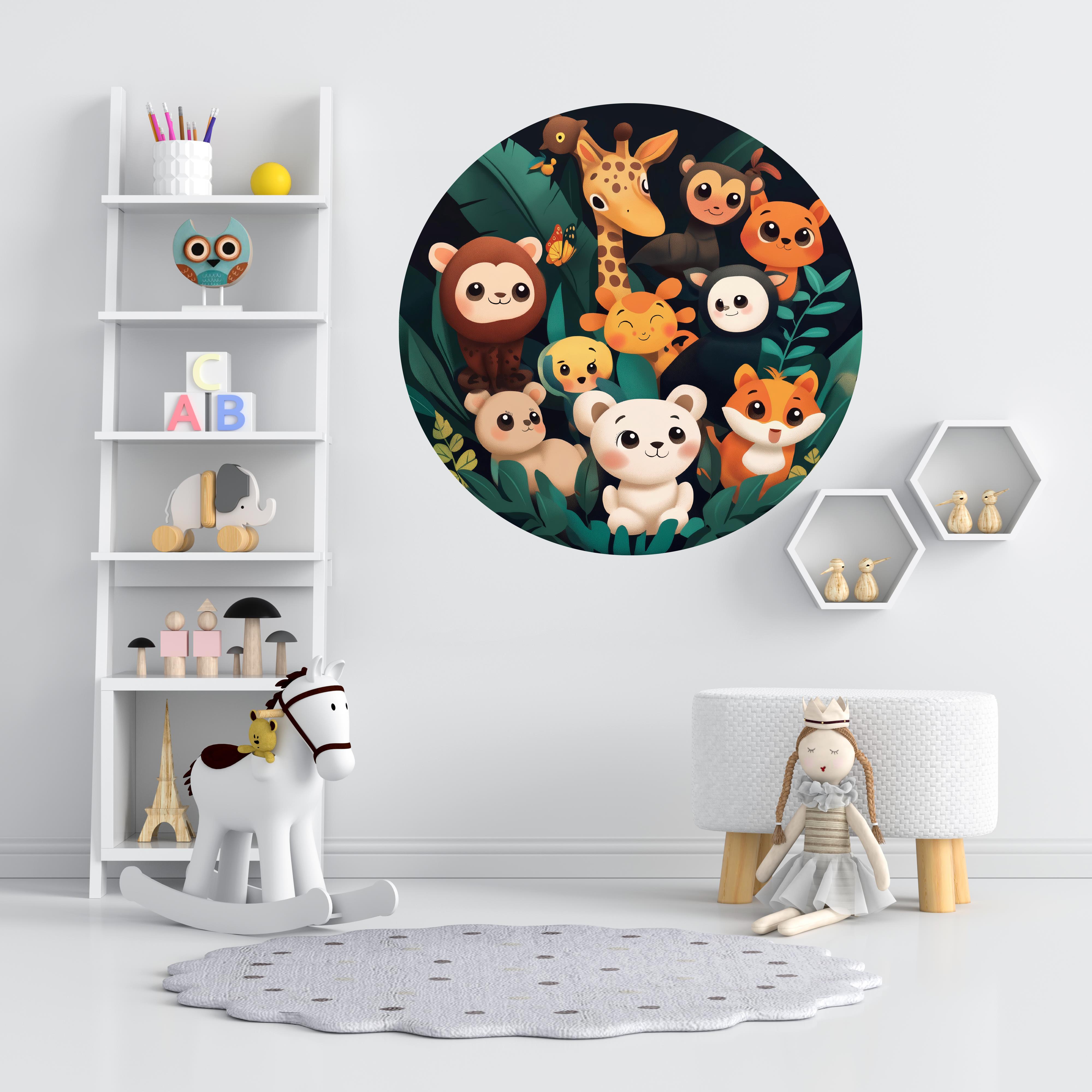 Çizgi Efektli Sevimli Hayvanlar Yuvarlak Sticker, Yuvarlak Şekilli Sticker, Çocuk Duvar Dekoru