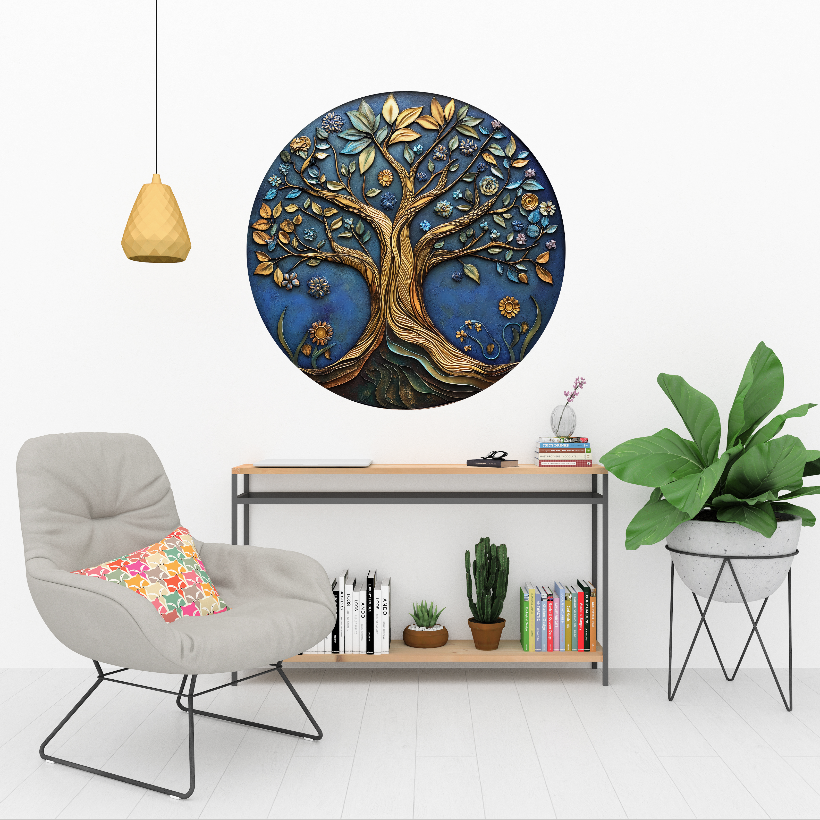 Hayat Ağacı Doğa Yuvarlak Sticker, Yuvarlak Şekilli Sticker, Renkli Yapraklar ve Çiçekler Duvar Dekoru