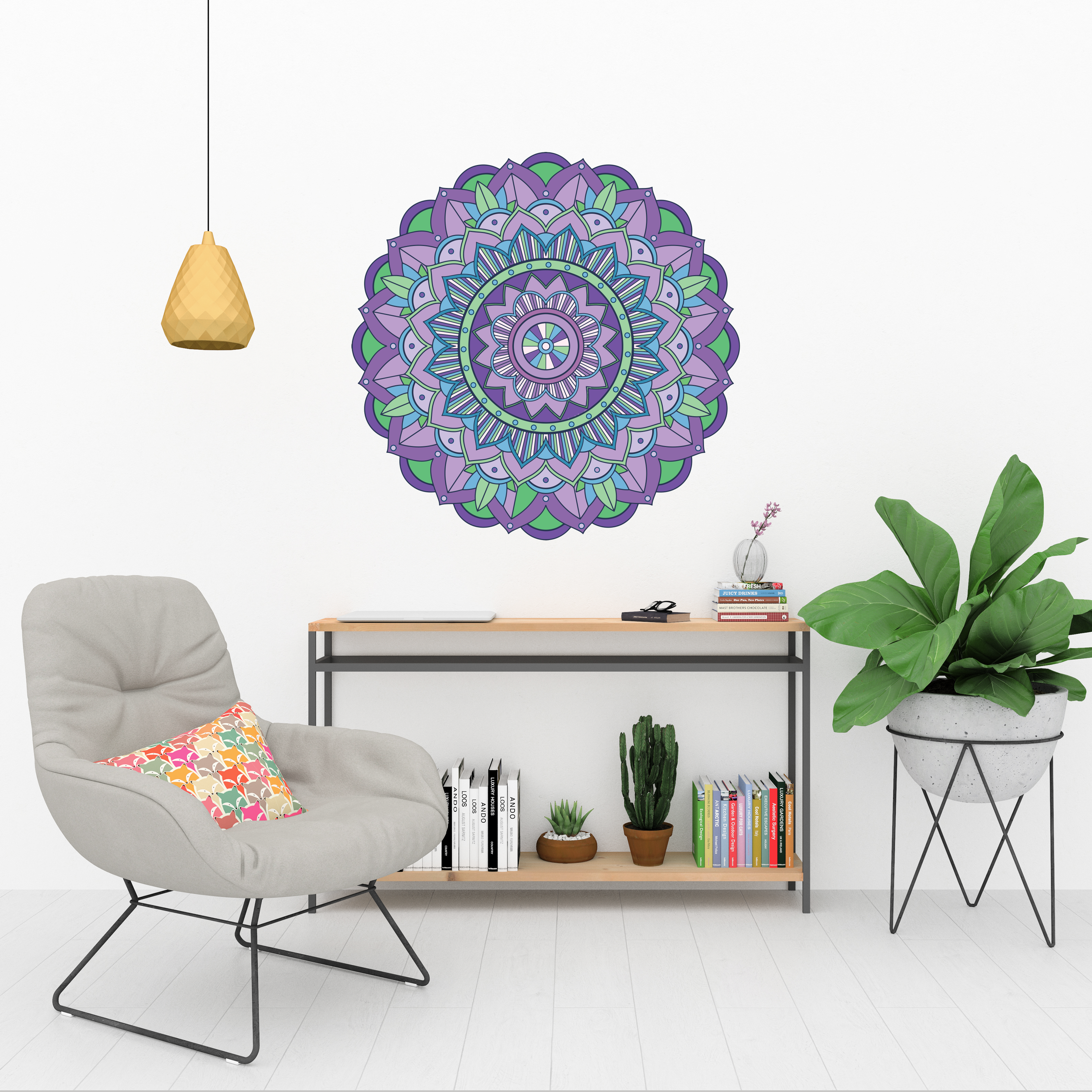 Mandala Koleksiyonu Mor Çiçek Deseni Yuvarlak Sticker, Yuvarlak Şekilli Duvar Stickerı, Çiçekli Duvar Dekoru (KSS-STCK-Y-13)