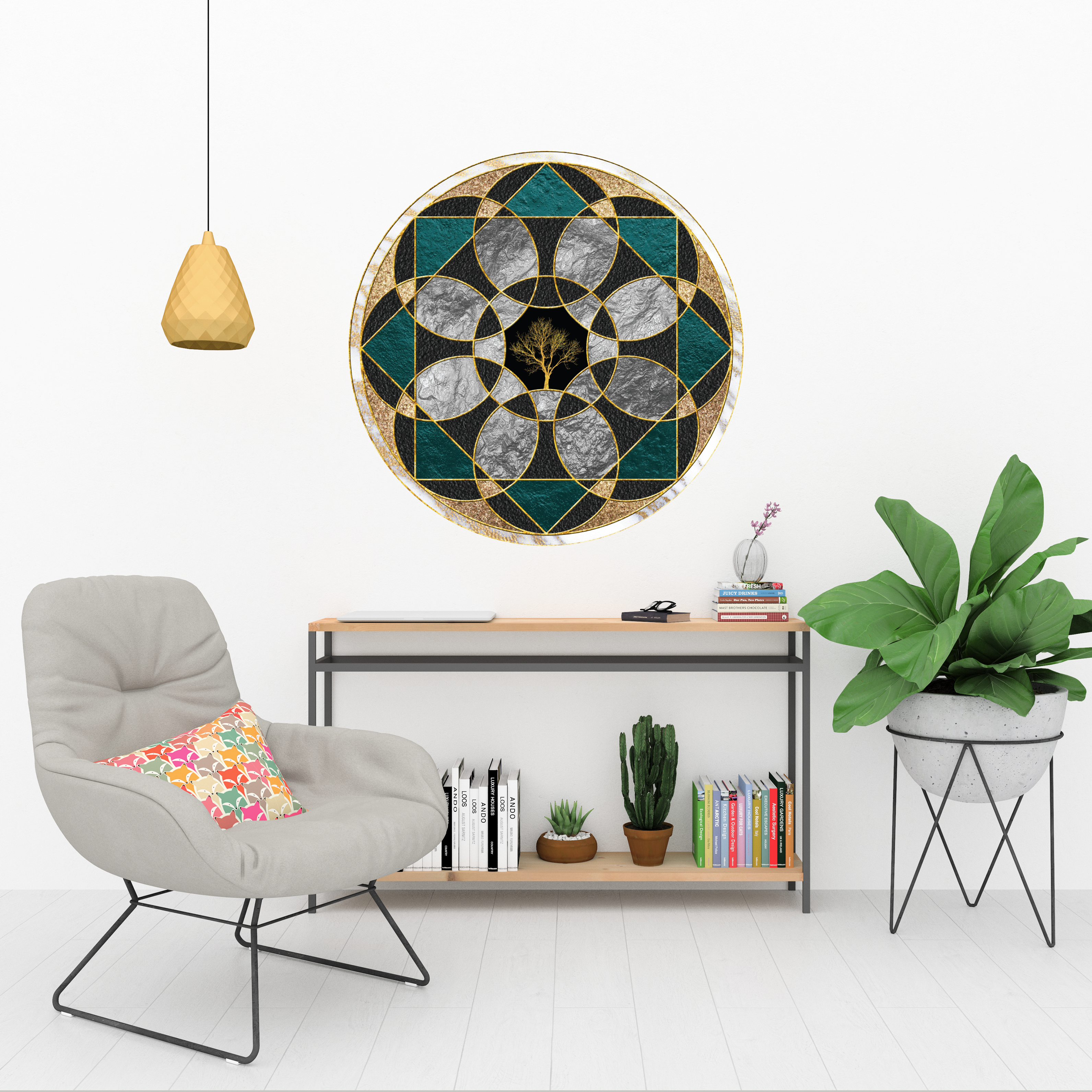Modern Geometrik Şekiller ve Sarı Ağaç Yuvarlak Sticker, Yuvarlak Şekilli Duvar Stickerı, Vitray Tarzı Duvar Dekoru (KSS-STCK-Y-32)