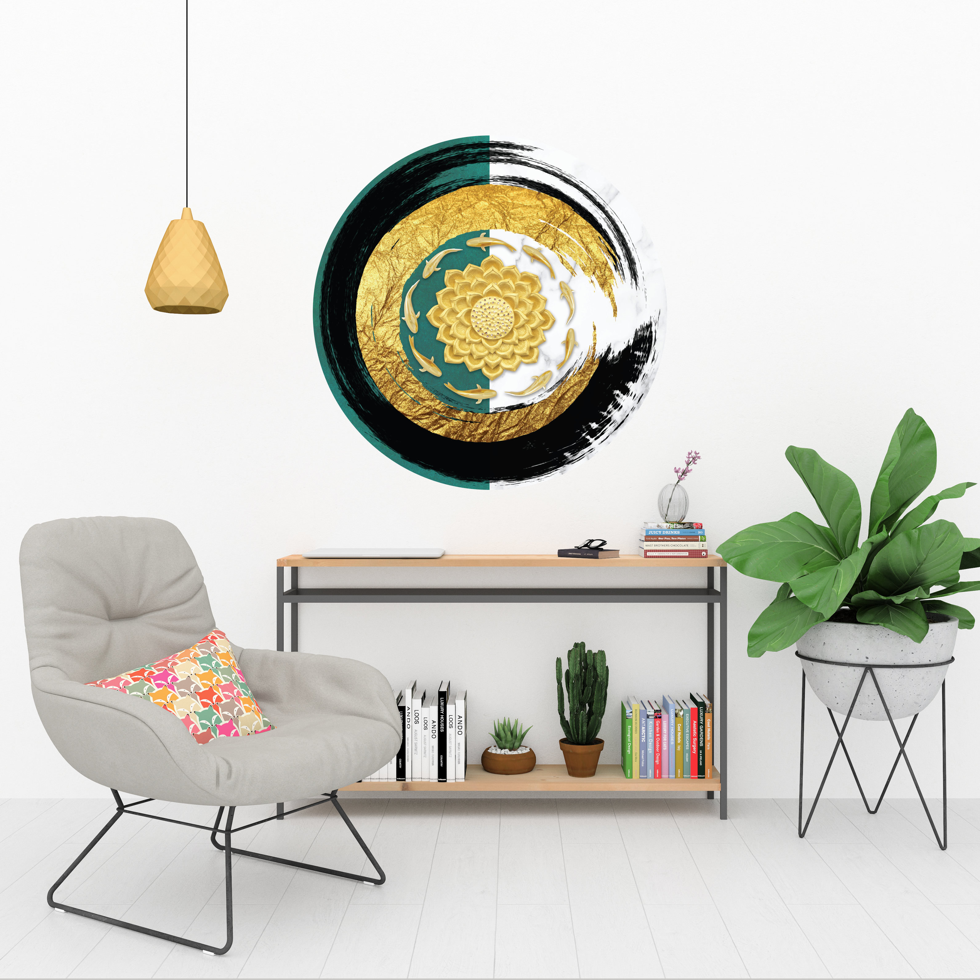 Modern Sanat Sarı Balıklar ve Çiçek Deseni Yuvarlak Sticker, Yuvarlak Şekilli Duvar Stickerı, Soyut Mermer Desenli Duvar Dekoru (KSS-STCK-Y-30)