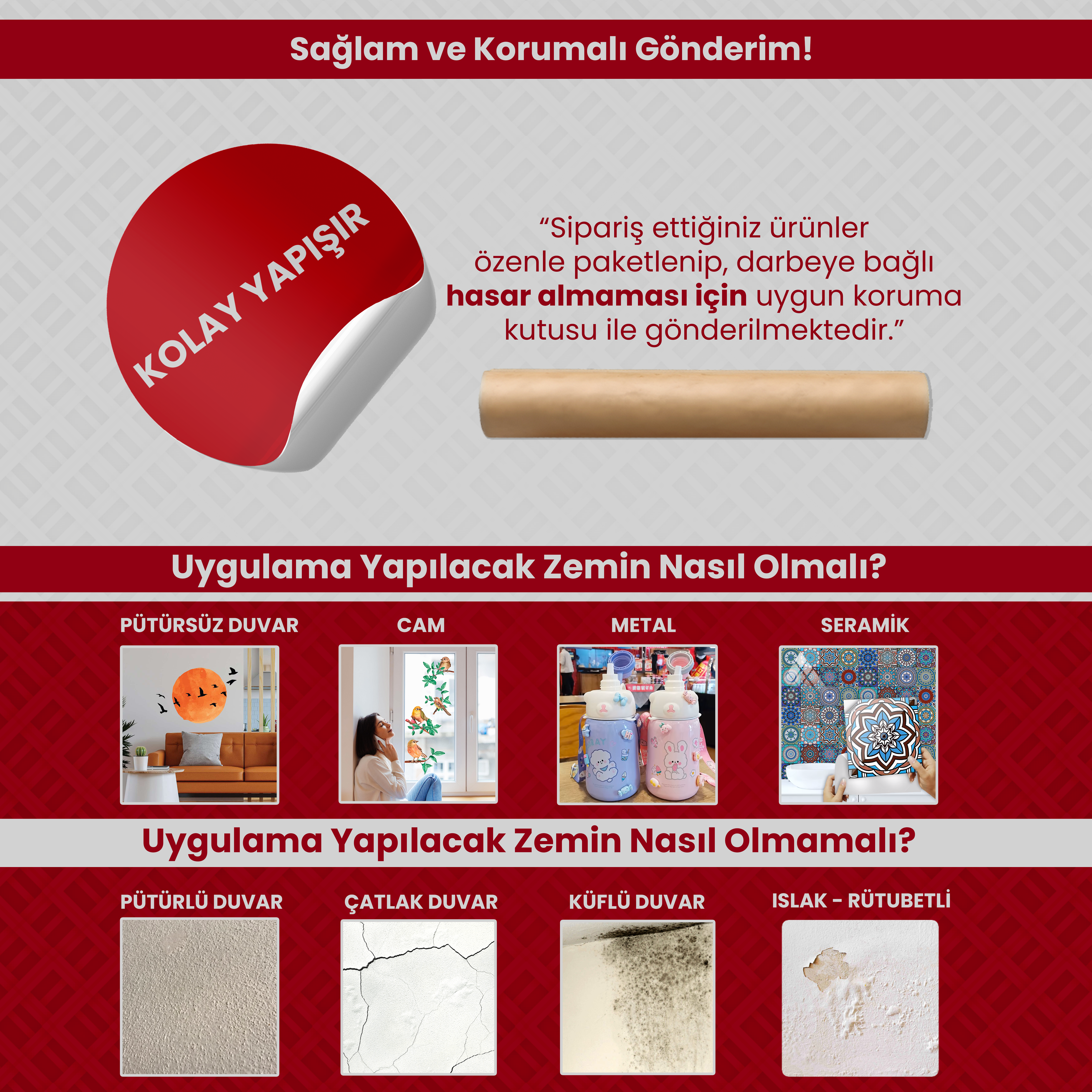 Kusursuz imal edilen çıkartma sticker, yapıştırmaya hazır şekilde size gelmektedir. Kredi kartı veya benzeri malzemeyi bir beze sarıp sıvama aracı olarak kullanabilir, uzmanlık gerektirmeden bir ucundan başlayarak baloncuk bırakmadan yapıştırabilirsiniz. Kendinden yapışkanlı olması sayesinde uygulaması oldukça pratiktir. Büyük ebatlı sticker (folyo) ürünlerimizde yardım alarak uygulamasını yapmanız önerilmektedir. Ürün uygulamada verilen 2 veya daha fazla parça arası boşluğuna göre daha fazla/az alan kaplayabilir. Şeffaf ürünlerimiz beyaz veya açık renk zemin üzerinde daha güzel görünmektedir. Koyu zemin için şeffaf ürün tavsiye etmiyoruz. %100 ithal malzemedir ve dünyanın bilinen en kaliteli markalarındandır.