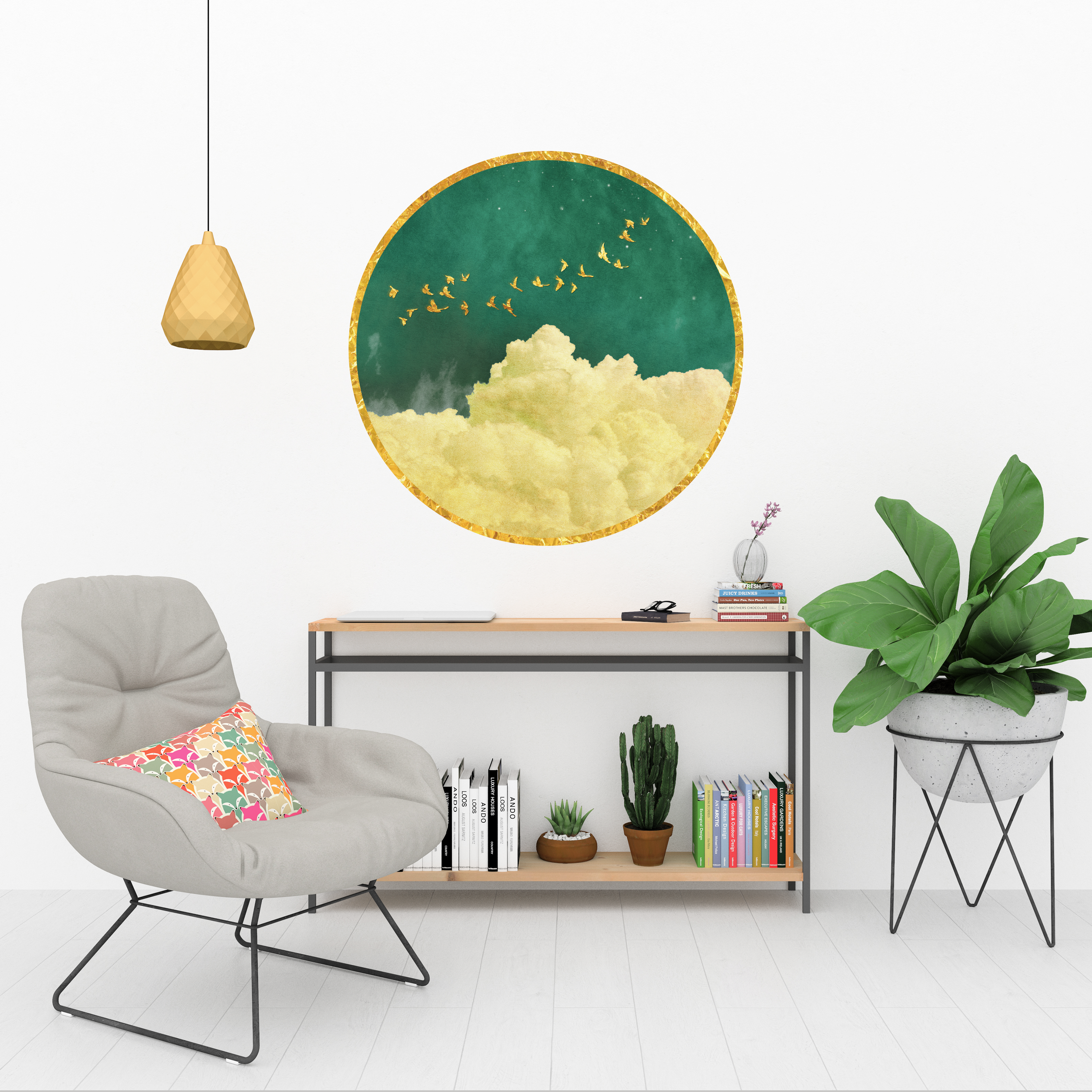 Sanatsal Gökyüzü Bulutları ve Sarı Kuşlar Yuvarlak Sticker, Yuvarlak Şekilli Duvar Stickerı, Modern Soyut Duvar Dekoru (KSS-STCK-Y-35)