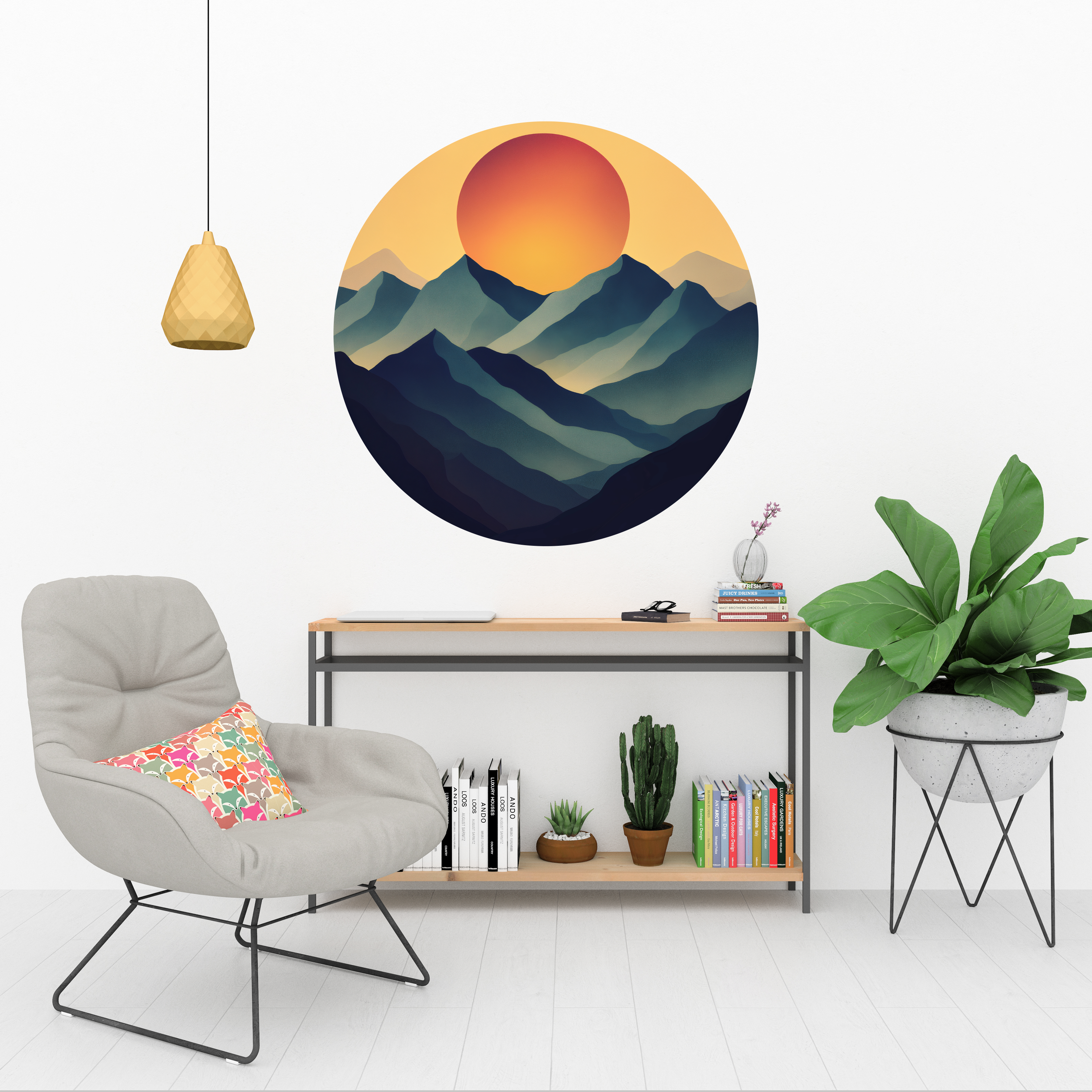 Soyut Dağlar ve Güneş Yuvarlak Sticker, Yuvarlak Şekilli Sticker, Minimal Renkli Modern Duvar Dekoru