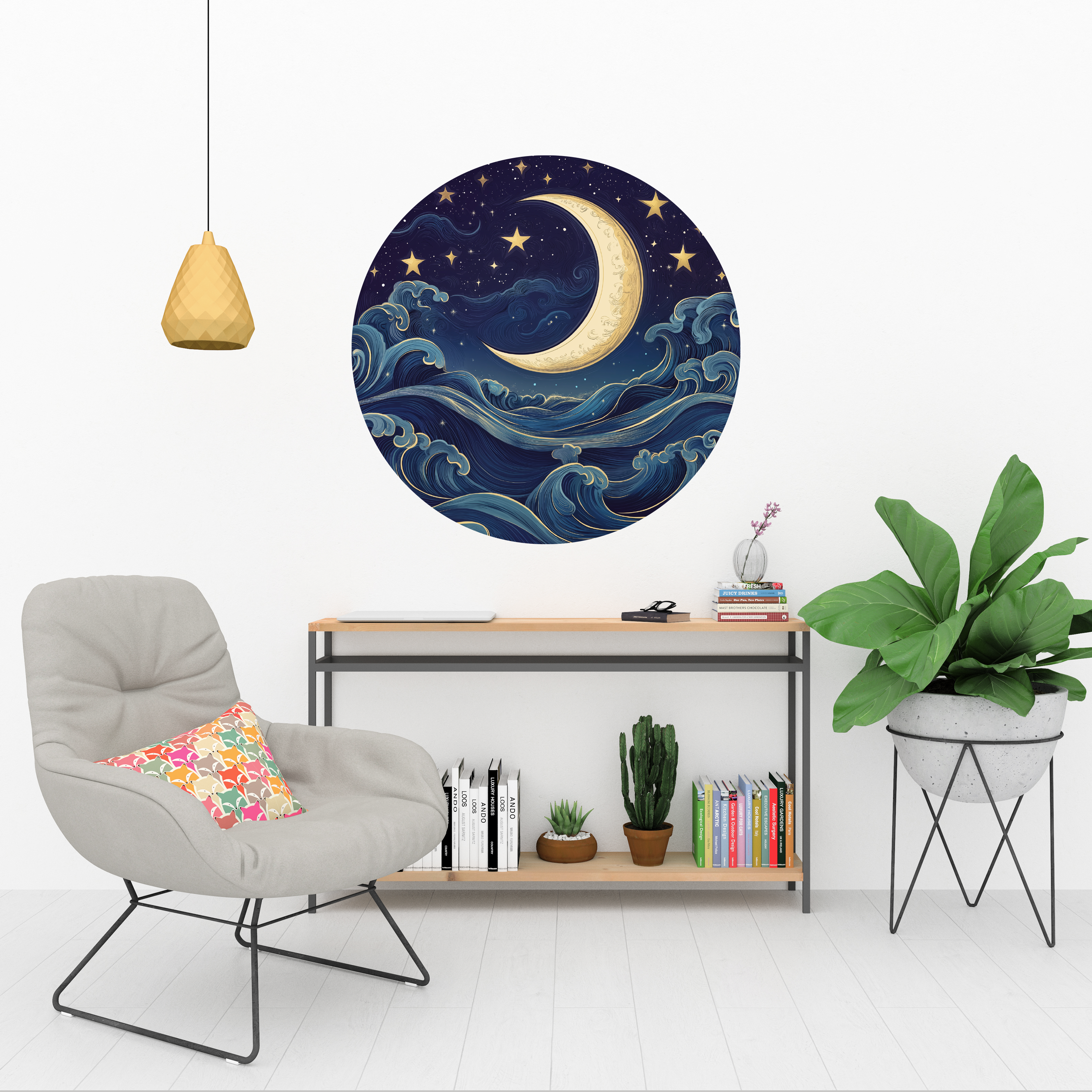 Soyut Gece Manzarası Yuvarlak Sticker, Yuvarlak Şekilli Sticker, Ay ve Yıldız Duvar Dekoru