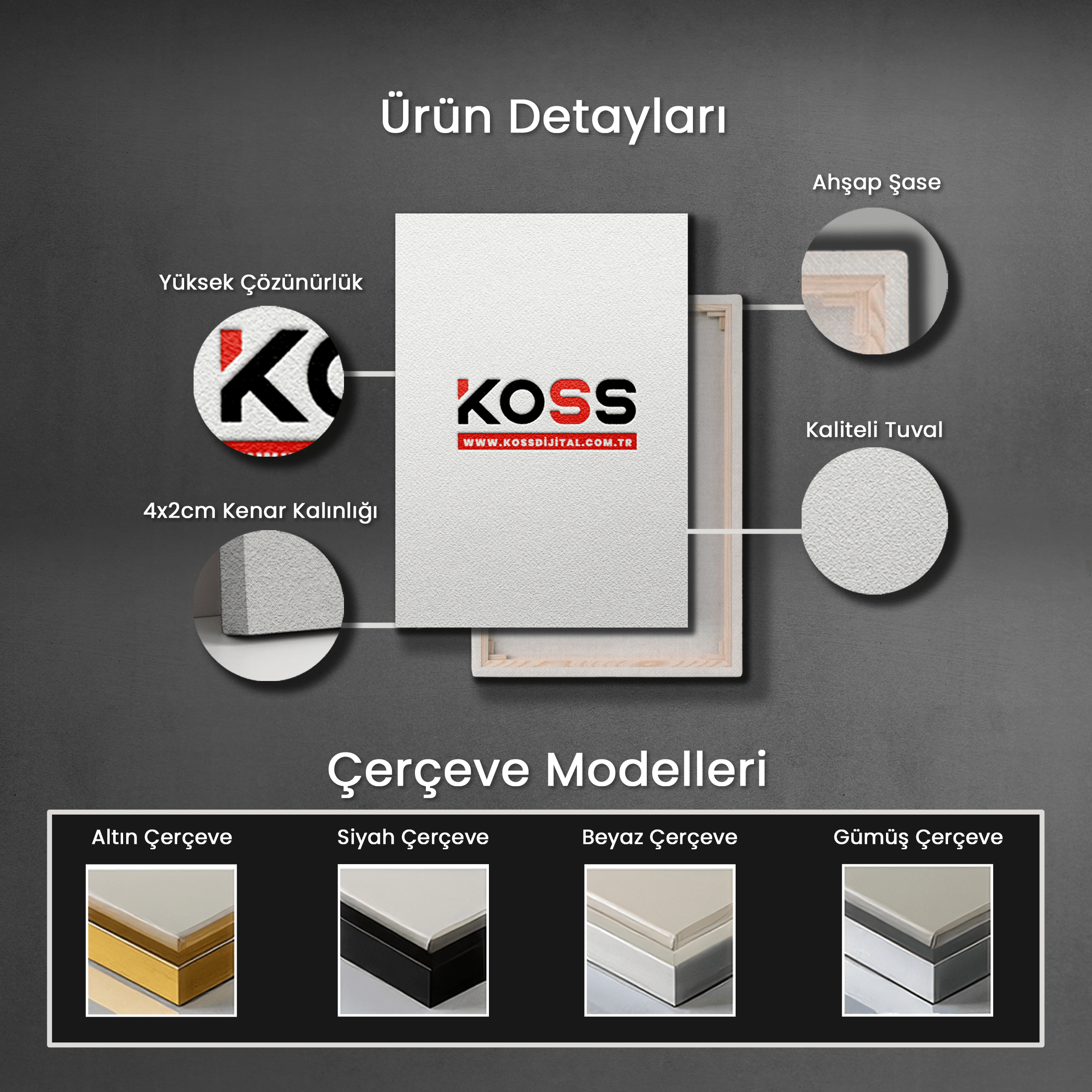 KOSS Dijital kanvas tablo modeli, yüksek kaliteli tuvalin dayanıklı bir ahşap çıta üzerine gerilmesi ve zımba yardımıyla arka kısmından birleştirilmesi ile oluşur.