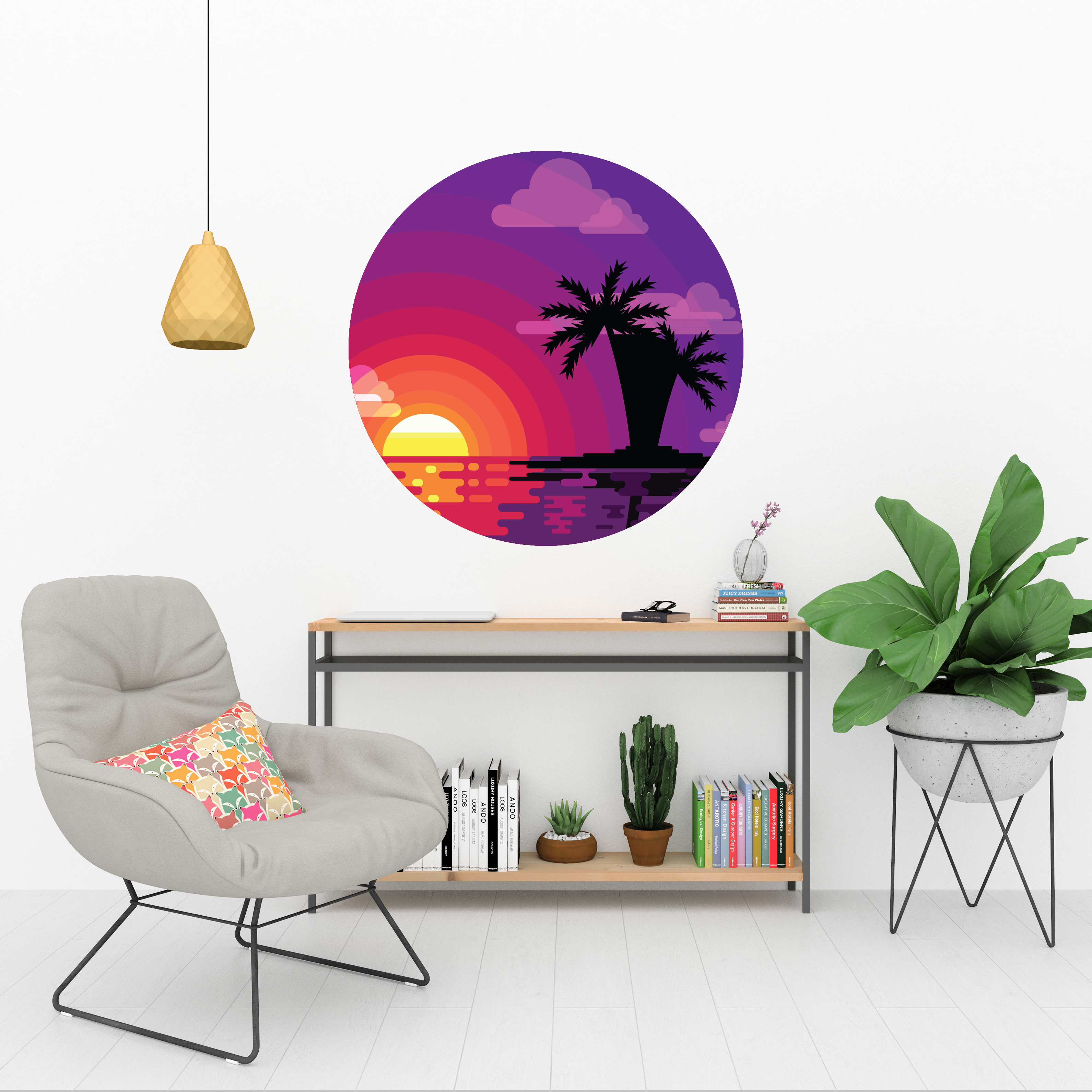 Tropikal Palmiye Ağaçları Yuvarlak Sticker, Yuvarlak Şekilli Duvar Stickerı, Yaz Gün Batımı Duvar Stickerı (KSS-STCK-Y-05)