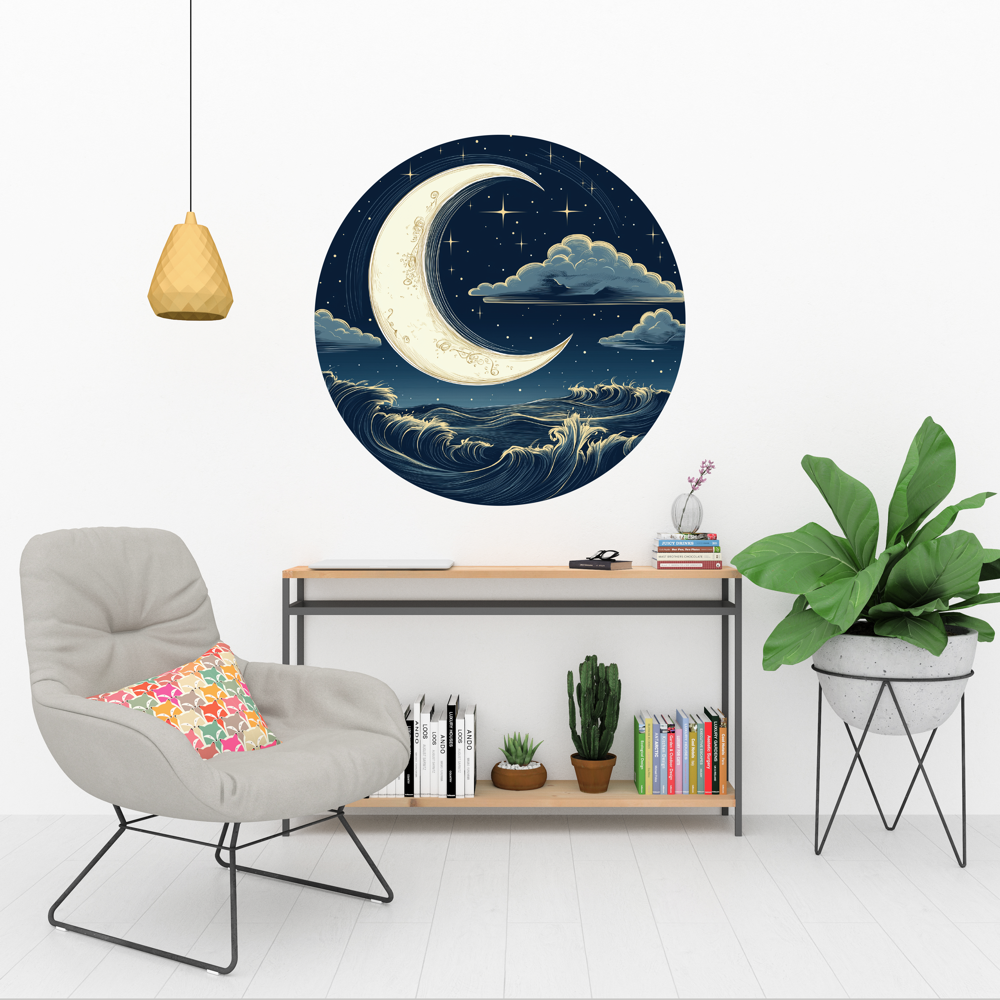 Yıldızlı Gece Manzarası Yuvarlak Sticker, Yuvarlak Şekilli Sticker, Ay ve Yıldız Duvar Dekoru